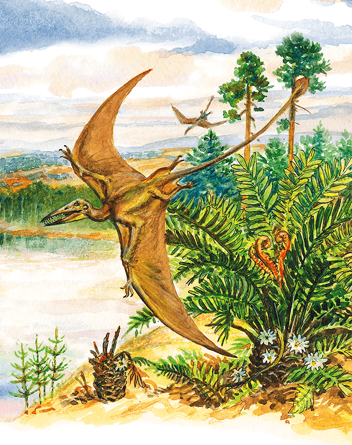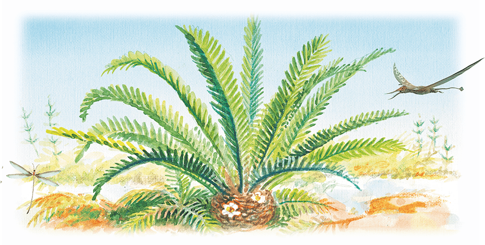 И было чем любоваться. Великолепную зелень папоротников дополняли шершавые стволы саговников. Одни из них напоминали прямые колонны, устремлённые ввысь на десяток и более метров. Вершину стволов венчали крупные стробилы – мясистые «шишки», обрамлённые пучком длинных и перистых листьев. Другие саговники были похожи на низкие кряжистые пни, густо обросшие сверху поникающими ветвями.