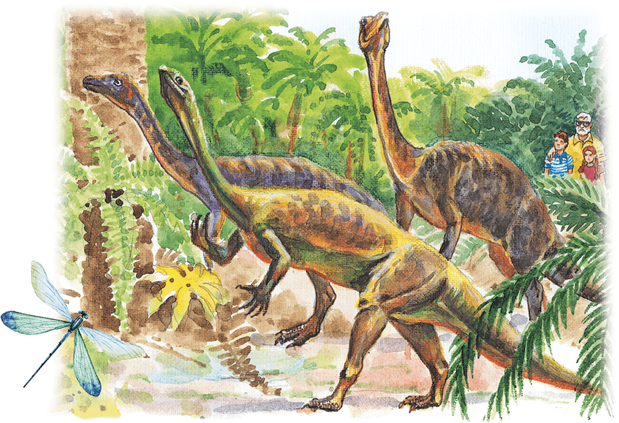Журчащее пение звучало всё громче. Всколыхнулись папоротники. Среди зелени промелькнули змеиные головки на длинных шеях. Профессор присел. Макс пригнул к земле растерянную сестричку.