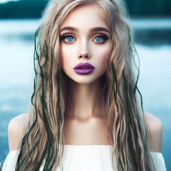 Послышался плеск воды. Мы увидели, как из воды выходит симпатичная девушка, с длинными, распущенными, русыми волосами. В прядях виднелась тина. Кожа имела бледный, даже синеватый оттенок. Сине — фиолетовые губы. Красивые голубые глаза с длинными ресницами. Платье не сильно облегающее и чисто белое. Выйдя на берег, она низко поклонилась Кощею.