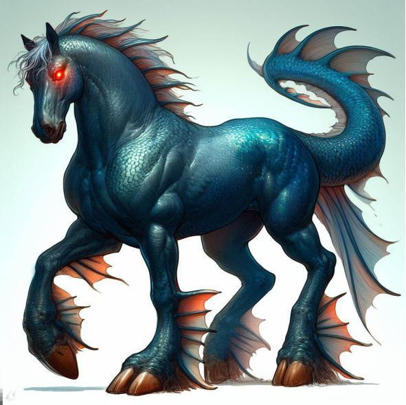 Из воды стал кто — то выходить. Голова была лошади. Сильные, мускулистые ноги, от колен струились плавники. Вместо копыт, пальцы с перепонками. Грива и хвост тоже были плавниками. Глаза сверкали алым огнём. Массивное тело было голубовато — синего оттенка и сверкало на солнце. От такого зрелища дух захватывало. Он лёг рядом с русалкой.