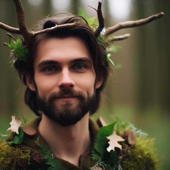 Он был приятной внешности, во взъерошенных коричневых волосах, виднелись рога в виде веток. Ростом был среднего. Одежда состояла из листьев, травы и коры. Плащ был из мха. Глаза зелёные и добрые. Улыбка была настолько чарующая, что страх испарился. Руки казались грубыми, но на ощупь очень мягкие.