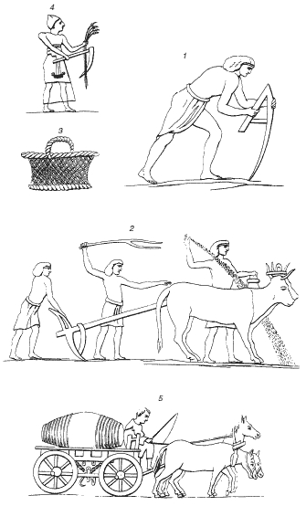 Египетские работники: 1 – египтянин разрыхляет землю примитивной киркомотыгой; 2 – работник управляет плугом, который тянут привязанные за рога волы, другой работник разбрасывает семена. Рисунок взят из подземного хранилища в Илифии; 3 – корзина для ношения семян. На царских могилах в Фивах можно видеть рисунок, изображающий сеятеля с похожей на эту корзиной, атрибутом, который носил на спине Осирис; 4 – египтянин с серпом, по форме сильно напоминающим косу. Денон из французской экспедиции доказал, что зерно также жали косами; 5 – транспортировка винной бочки
