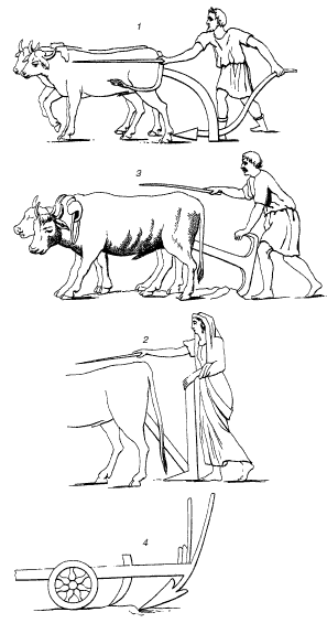 Уже упомянутый нами примитивный плуг был чрезвычайно прост: никаких колес, только ручка, дающая возможность пахарю менять направление по своему усмотрению. В конструкции также отсутствовали железные или другие элементы из металла. Позже сделали плуг, состоящий из двух частей: одна была определенной длины, позволявшей впрягать волов, а другая, покороче, входила в землю. По форме он напоминал якорь. Плуг такого образца использовали греки. С той же целью они также часто применяли нечто похожее на вилы, с тремя-четырьмя зубцами. Плиний ставит в заслугу галлам изобретение плуга, поставленного на колеса. У англо-норманнского плуга колес не было. Пахарь управлял им одной рукой, а в другой нес палку, чтобы рыхлить комки.