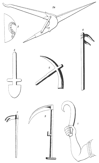 Земледельческие инструменты: 1 – простой серп; 2 – с зубьями; 2а – плуг из «Георгик» Вергилия; 3 – коса, очень похожая на современную; 4 – лопата, рукоятка которой снабжена двойной перекладиной, зафиксированной на небольшом расстоянии от заступа, для опоры ступни. Подобные лопаты по-прежнему используют в Италии и южных областях Франции; 5 – киркомотыга, такой она изображалась на различных саркофагах. Если оконечность кирки делалась плоской, инструмент называли киркомотыгой; 6 и 7 – мотыги. Первая с гравированного камня в «Памятниках древности» Винкельмана