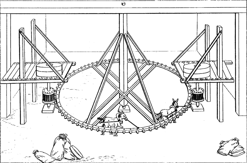 Приблизительно за два века до нашей эры римляне, победоносно пришедшие в Азию, принесли с собой ручные мельницы. Это завоевание индустрии способствовало огромному прогрессу, и труд человека постепенно облегчили покорные лошади и ослы. С тех пор часто упоминались два вида мельниц: ручные, manuales, и приводимые в действие животными, iumentariæ.