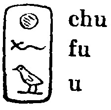 And as by our language we belong to the Aryan stratum, we belong through our letters to the Hamitic. We still write English in hieroglyphics; and in spite of all the vicissitudes through which the ancient hieroglyphics have passed in their journey from Egypt to Phœnicia, from Phœnicia to Greece, [pg 018] from Greece to Italy, and from Italy to England, when we write a capital F [Cursive F], when we draw the top line and the smaller line through the middle of the letter, we really draw the two horns of the cerastes, the horned serpent, which the ancient Egyptians used for representing the sound of f. They write the name of the king whom the Greeks called Cheops, and they themselves Chu-fu, like this:8—