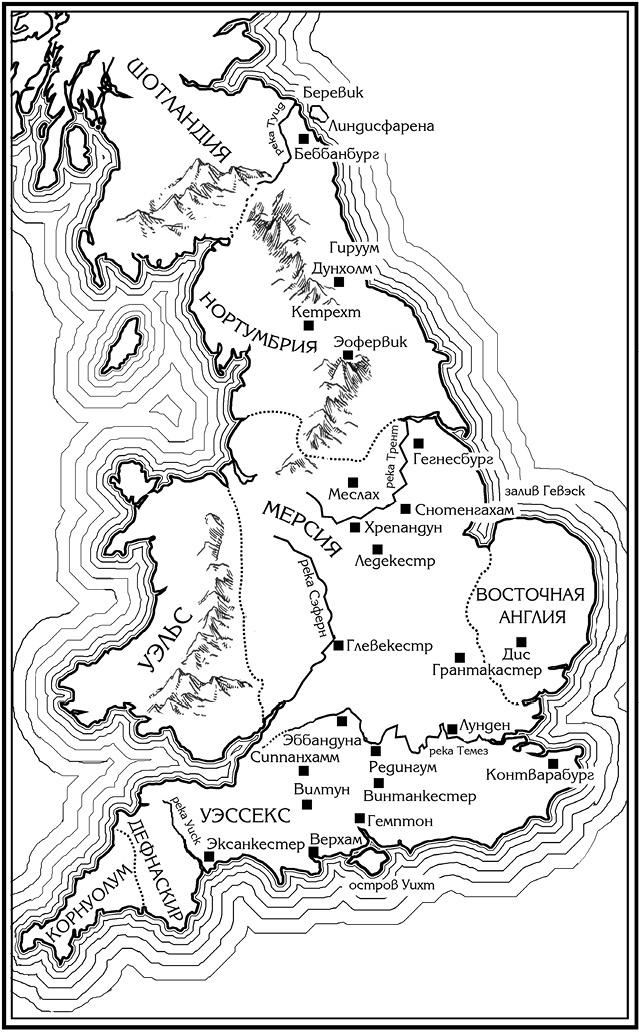 Без сомнения, у читателей есть свои любимые варианты в том списке, который я привожу ниже. Но я принимаю написание, предложенное «Оксфордским словарем английских географических названий», хотя словарь, разумеется, не является истиной в последней инстанции. В упомянутом словаре приводятся написания, относящиеся примерно ко времени правления Альфреда — 871–899 годам н. э.; к примеру, название острова Хайлинга в 956 году писалось и Хейлинсиге, и Хаэглингейгге. Сам я тоже не был слишком последователен, прибегая к современному написанию «Англия» вместо «Инглаланд», используя «Нортумбрия» вместо «Нортхюмбралонд» и в то же время давая понять, что границы древнего королевства не совпадали с границами современного графства.