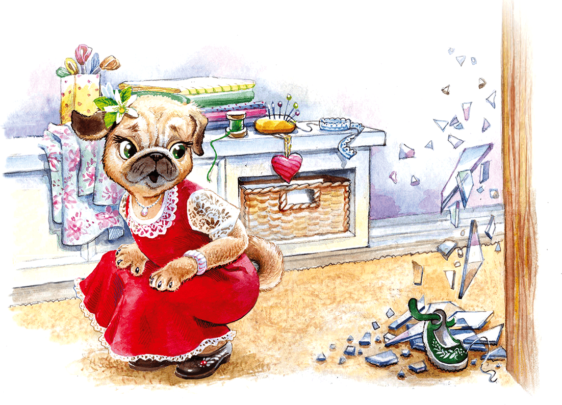 Куки схватила со стола туфельку, которую только что старательно вышивала Зефирка, и кинула ее в самую младшую мопсиху.