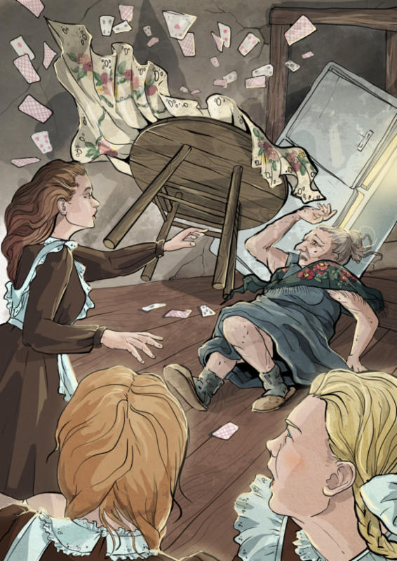 Стоял такой грохот, что девочки не успели даже испугаться, просто изумились происходящему: еще минуту назад перед ними сидела женщина с картами, которая хоть и была странновата, но вполне вписывалась в мироустройство своего жилища и в общую атмосферу вечера. Поэтому за эти считанные секунды в их голове не успело пробежать ни одной мысли, оправдывающей происходящий ужас и отчаяние ведьмы.