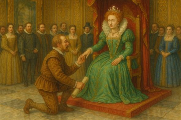 Тронный зал Уайтхолла, украшенный великолепными гобеленами, сиял позолотой. Придворные в роскошных нарядах выстроились вдоль стен, создавая живой коридор, по которому Дрейк шел к трону. Он шел, чуть покачиваясь, словно палуба все еще была под ногами, и его морская походка резко контрастировала с изящными движениями придворных щеголей.