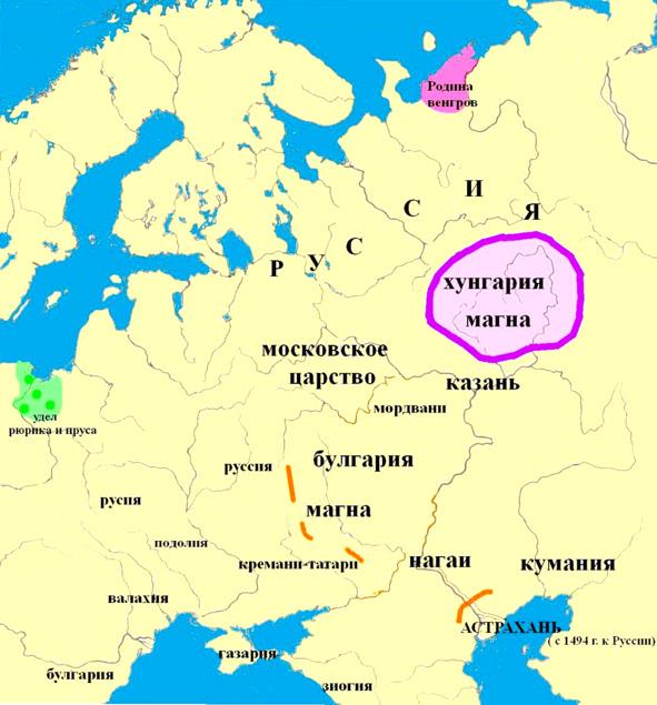 В начале 13 века кочевая империя монголов подчинила себе Русь. Монголы передали русским механизмы функционирования имперской администрации, но не более того (видимо русские, персы, арабы, китайцы, турки не знали, как функционирует имперская администрация, и вдруг получили ее из степи, но европейцы остались в микрогосударствах). Единственное, что объединяло монголов и Русь, — то, что они были частями одной имперской системы. Их культура, религия и образ жизни отличались радикально (чем радикально различались культура, религия и образ жизни в рамках одной империи не ясно). Московские князья оказались лучшими учениками монголов. До ига Москва была провинциальным городом; после него стала политическим центром Руси (деревнями были Мадрид, Варшава, Копенгаген, Берлин, Вена, Лиссабон, Вильнюс, Рига и также после 15 в. они стали политическими центрами). Тому способствовал распад Орды на несколько ханств и княжеств в 15 веке, приведший к образованию в Восточной Европе своеобразного «вакуума власти». Он был заполнен благодаря усилиям русских великих князей — Ивана III, Василия III и Ивана IV (распад Германской империи ничем заполнен не был?). Они расширили границы своего царства на востоке за Волгу, на юге — до Каспийского моря, на западе — до Днепра и на севере — до Белого моря. Так возникла Московия. (Но они были государями «Вся Руси» и эти границы никогда границами Московии не были).
