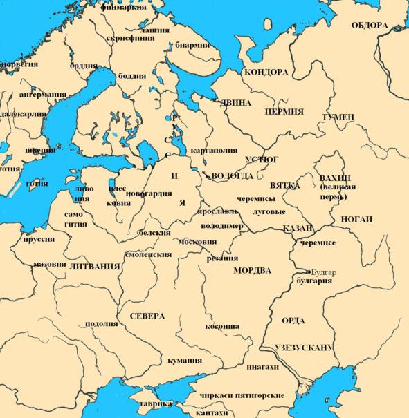 По описанию итальянских путешественников из Венеции в Тану и Татарию датируемому 1436 г. было три России — Великая Белая, Верхняя и Нижняя. В Великой Белой России имелась Москва, в Нижней России Житомир, в Верхней России объединенные Литва и Новгород. В Татарии находился Киев.