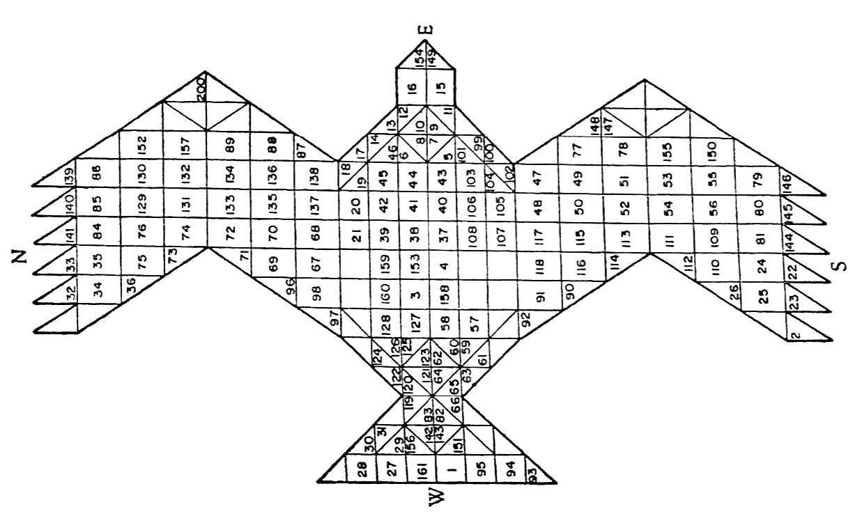 каждый слой должен повторять одну и ту же пространственную форму, но различаться внутренней конфигурацией[69]. Соколиный алтарь следует обращать на восток, знаменуя предстоящий символический полет воссозданного бога к восходящему солнцу — здесь мы видим уникальный пример божественного перевоплощения средствами геометрии.