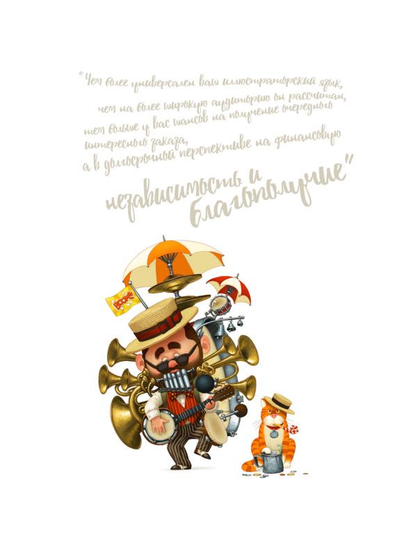 Иллюстратор же — это рыба, которая водится в более спокойной воде. Он всегда рисует под заказ, под конкретное задание, полученное от клиента, и под конкретную публику. И от того, насколько хорошо он выполняет это задание, зависит и его качество как профессионала, и успех всей его иллюстраторской карьеры. Возможно, творческая свобода иллюстратора более ограничена, чем вольного художника, но за это он получает более стабильное материальное положение. Так как, создавая работу, он уже знает, что она будет оплачена.