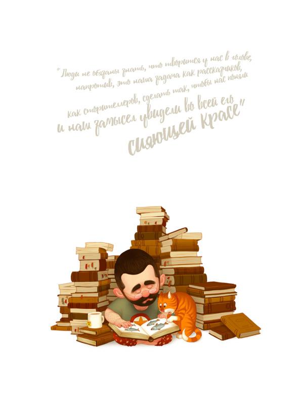 Несколько лет я преподавал иллюстрацию студентам и рассказывал им о принципах сторителлинга, стилизации и работе иллюстратора. Читал им одни и те же лекции и отвечал на одни и те же вопросы. Потом, устав преподавать, я начал выступать с лекциями на эти же темы, и снова всё повторялось, как в «Дне Сурка». Куда бы я не приезжал, в Бразилию ли, Мексику, США, Португалию, Израиль или Россию, я читал один и тот же отшлифованный многократным повторением текст, хоть и на разных языках.