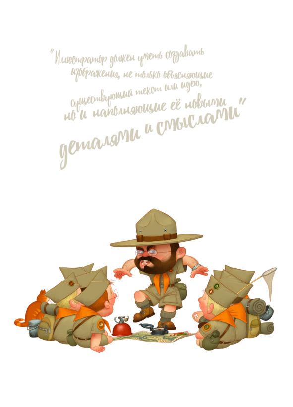 Иллюстратор смотрит на свою работу со стороны, задаёт сам себе неудобные вопросы, сам отвечает на них и, если нужно, вносит изменения до тех пор, пока все элементы его иллюстрации не встанут ровно на свои места. До тех пор, пока иллюстрация не станет кристально ясной, не допускающей малейших разночтений.