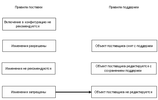 Чтобы сократить по возможности количество подобных объектов и облегчить тем самым обновление конфигурации, механизм поставки и поддержки позволяет задать для объектов конфигурации правила поставки и правила поддержки.