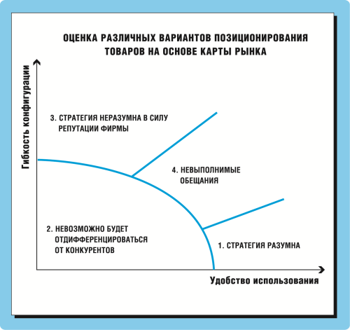 Что касается зоны 4, то попадание туда нового товара поначалу может показаться нам хорошим результатом. На первый взгляд это означает, что покупатели ожидают от нашего товара как большей легкости использования, так и повышенной гибкости конфигурации, что, казалось бы, и есть ключ к рыночному успеху нового товара в нашей продуктовой линейке. Но ведь реально этот новый продукт не сможет оправдать всех ожиданий покупателей, и поэтому в длительной перспективе это будет катастрофой для имиджа товарного ассортимента нашей фирмы.