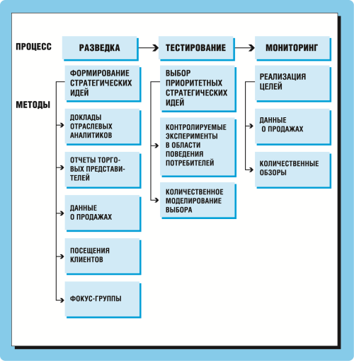 Запросы рынка. Маркетологи фирмы могут оценить запросы рынка с помощью маркетинговых исследований и прежде всего – метода декомбинационного анализа[3] (Conjoint Analysis), суть которого рассматривается при обсуждении идеи 31. Топ–менеджерам необязательно знать суть этих методов, достаточно быть в курсе того, что современный маркетинговый инструментарий достаточно разнообразен и отлажен, чтобы оценивать запросы потребителей достаточно адекватно. Кроме того, важнейшим источником необходимой информации являются опросы клиентов, уже покупающих товары или услуги нашей фирмы. Представление о том, как может быть налажен процесс маркетинговых исследований в современной фирме, позволяет составить рис. 7–4, характеризующий организацию маркетинговых исследовании в компании «Hewlett–Packard».