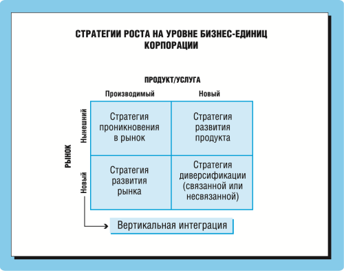 Особый вариант, т.е. некая разновидность стратегии несвязанной диверсификации, – стратегия вертикальной интеграции. Ее суть в том, что компания пытается поставить под свой контроль либо своих поставщиков, либо какие–то элементы каналов продвижения, чтобы контролировать рынок (она способна это делать, работая с независимыми поставщиками или независимыми торговыми посредниками). Такая стратегия довольно рациональна с точки зрения минимизации издержек или улучшения продвижения своих товаров, но в то же время она порождает массу проблем, связанных с тем, что теперь топ–менеждерам приходится контролировать совершенно разнородные бизнесы. Тем не менее в ряде случаев это является вполне рациональным вариантом стратегии для компании, которая хочет укрепить свою позицию на рынке. Так, на российском рынке именно эта стратегия стала основой успешного развития таких разных компаний, как «Северсталь», «Панинтер» и «Шатура».