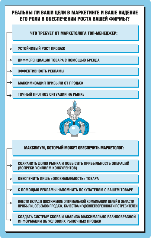 Маркетинговая служба может сделать для фирмы очень многое, хотя и не все, что может пожелать топ–менеджер. Но что же реально маркетологам по силам?