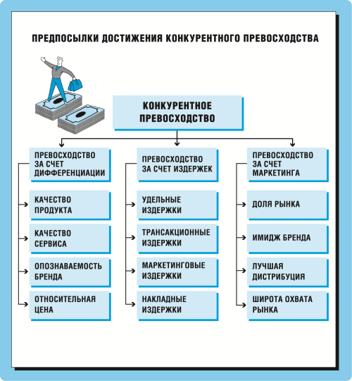 Первейшая обязанность топ–менеджера – поиск способов обеспечения преимущества своей фирмы над конкурентами. В экономике административного типа это обеспечивается за счет «своих людей» в государственных органах управления. Но если этот ресурс недостаточен, недоступен или не обеспечивает беспроблемного господства на рынке, то удерживать клиентов и обеспечивать получение выручки и прибыли приходится иными методами. И тогда перед топ–менеджером во весь рост встает вопрос: «За счет чего может быть достигнуто конкурентное преимущество на современных рынках?»