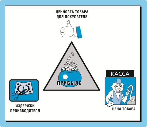 Смысл этого рисунка в том, что для увеличения прибыли менеджер должен выбирать какой–либо из способов «изменения формы и площади треугольника прибыли», корректируя либо издержки, либо цену, или, наконец, ценность товаров для покупателей.
