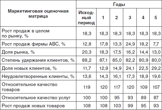Матрица внешней оценки по конечным результатам хорошо формируется с помощью таких важнейших индикаторов рыночного успеха фирмы, как реально завоеванная ею в истекшем году доля рынка и доля клиентов, которые в опросах или переговорах заявляют о своем намерении покупать ее товары или услуги и в будущем году. Не менее важно обратить внимание на такой неправомерно забываемый показатель, как рост продаж новых товаров – то, без чего все труднее теперь выживать на всех рынках. На современном рынке компания очень редко может удержаться, продавая один и тот же товар многие годы. Спрос и преференция покупателей все время меняются, поэтому динамика такого показателя, как рост продаж новых товаров, должна быть тоже в центре внимания менеджеров.
