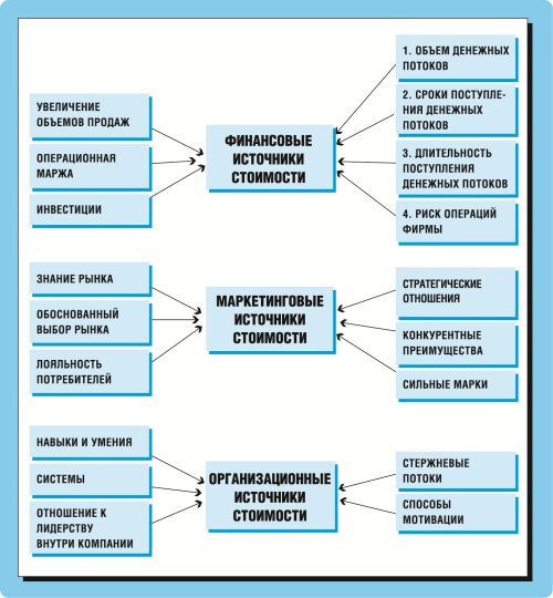Современный маркетинг все активнее осваивает язык и логику управления стоимостью бизнеса (Value Based Management) и все более приучается проверять эффективность своей деятельности через критерий роста стоимости бизнеса. В этой логике мы можем выделить три типа источников роста стоимости бизнеса и соответственно выгоды собственников: 1) финансовые; 2) маркетинговые и 3) организационные источники стоимости.