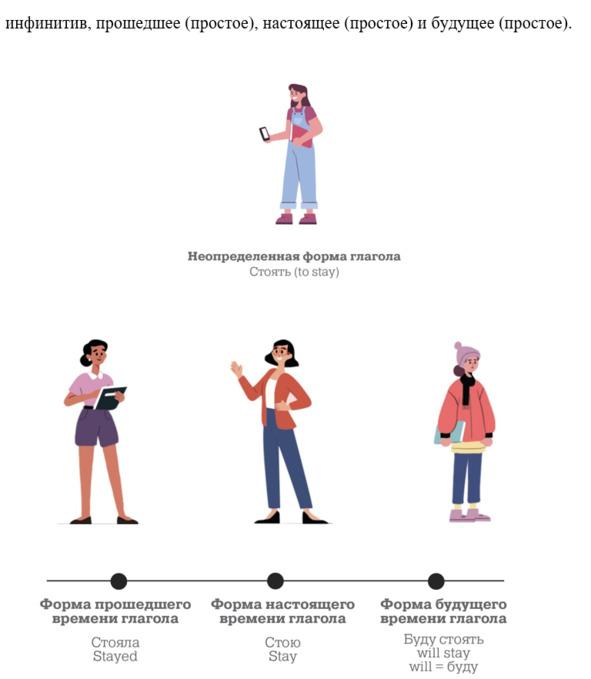 Только что мы рассмотрели инфинитив и личную форму относительно к настоящему времени. Теперь давайте возьмем один глагол и на временной школе рассмотрим, как инфинитив превращается в личную форму в трех временах: прошедшее, настоящее, будущее.
