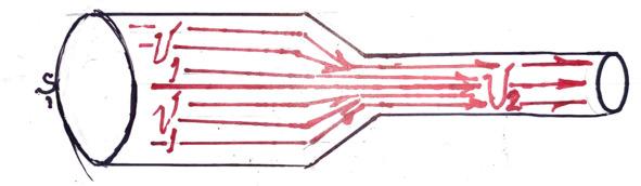 Может ты в детстве в ручейках запруды строил? Если строил, то должно быть помнишь, что если маленькую дырочку в плотине сделать, то вода с шумом, т.е. с большей скоростью, под большим давлением из этой плотины будет вырываться, а если дырочку увеличивать, то шума будет поменьше, скорость воды тоже, а напор уменьшится. Но, масса воды за единицу времени не изменится! Просто давление на стенки запруды уменьшится.