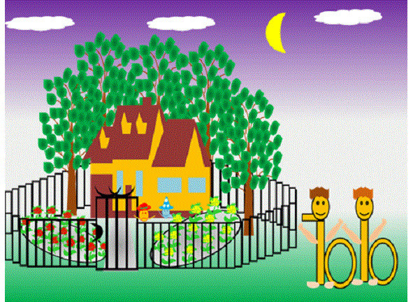 Домик обнесён металлическим забором. Он представлял собой прозрачную решётку, сквозь которую виднелись клумбы с красивыми цветами жёлтого и красного цвета. Деревья окружали домик зелёной стеной. Они стояли гордо и величаво, как часовые.