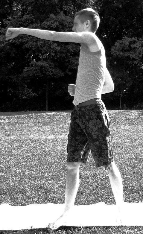 Выполнение: на выдохе – слегка повернуть корпус вправо, вытягивая левую руку вперед и сжимая кисть в кулак, как будто мы захватываем рукой некую перекладину на уровне пояса.