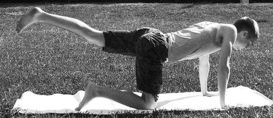 Выполнение: на вдохе – поднять правое колено, разворачивая его вправо и вверх (носок вытянут и направлен внутрь). Во время движения можно даже чуть присесть на опорной ноге.