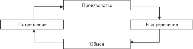 Наконец, потребление означает использование изготовленных благ для удовлетворения человеческих потребностей. Полезные вещи в процессе их потребления исчезают, в силу чего требуется вновь их производить. Поэтому движение экономического богатства возвращается к своему исходному пункту, как это изображено на рис. 4.